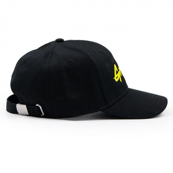 The black cap with round peak from the Manthey Grello collection. In addition to caps, the collection also includes other products such as shirts, jumpers, jackets and accessories.