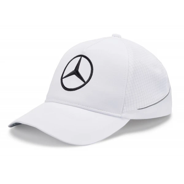 The embroidery on the front shows the Mercedes emblem, the back features the team logo. Another eye-catcher is the design in a grid pattern, which extends over the entire cap. The Velcro fastener on the back allows the size of the cap to be individually adjusted.