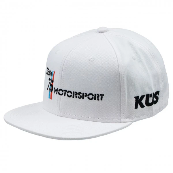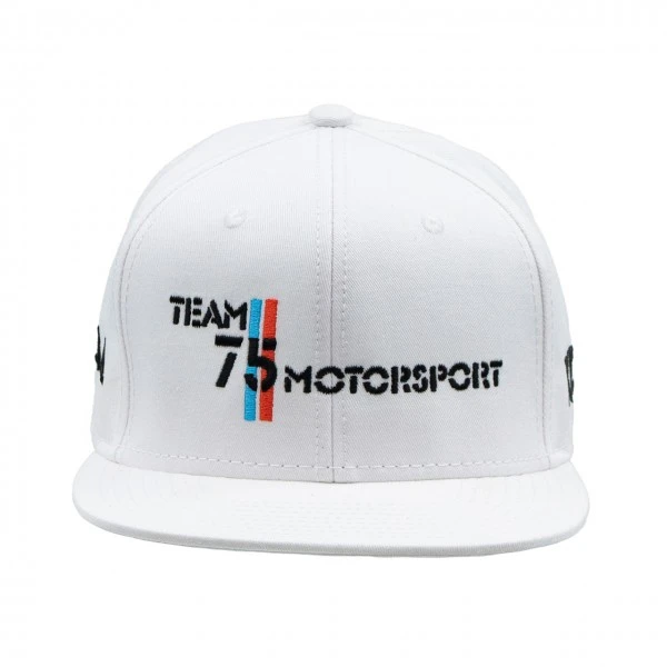 The cap in white from the Team 75 collection. The cap with a flat brim has a practical clip closure that allows you to adjust it to the desired size. The Team 75 logo is embroidered on the front. On the side, you can see the 75 with racing stripes. The material is made of high-quality cotton.